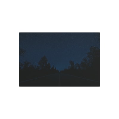 A tranquil starry sky above a silhouetted forest flanking an empty road at night.